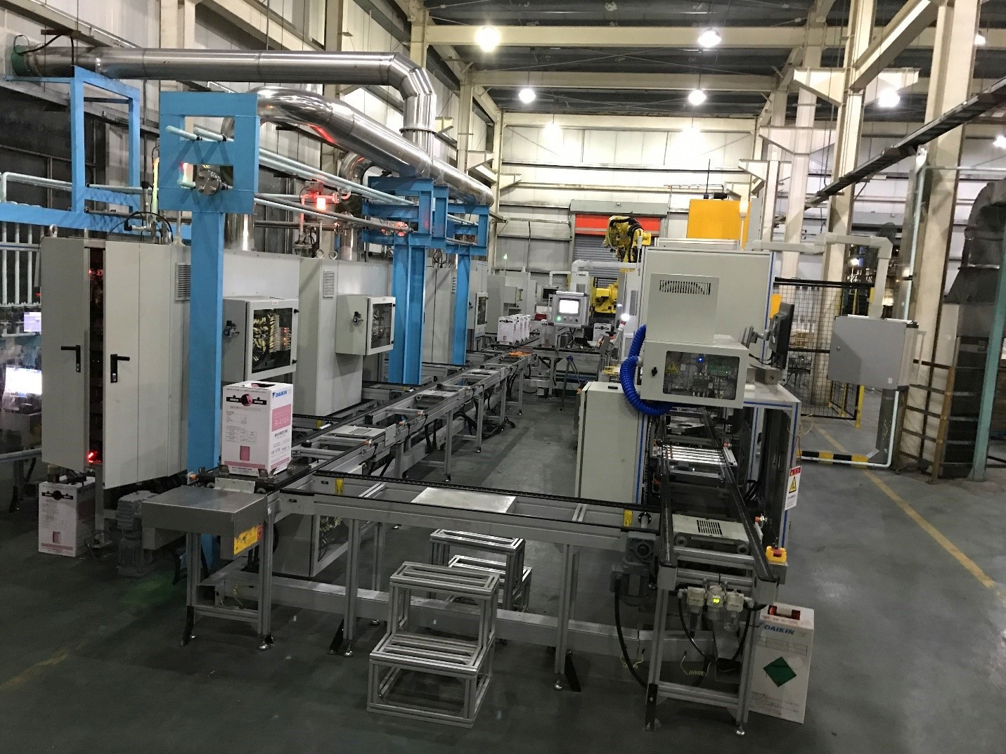 目前我们公司生产的针对氟利昂自动灌装生产线主要有泄露站,套膜站 视觉站 贴标站 剔除站 等组成。下面将整体一条自动化灌装生产线展示一下。